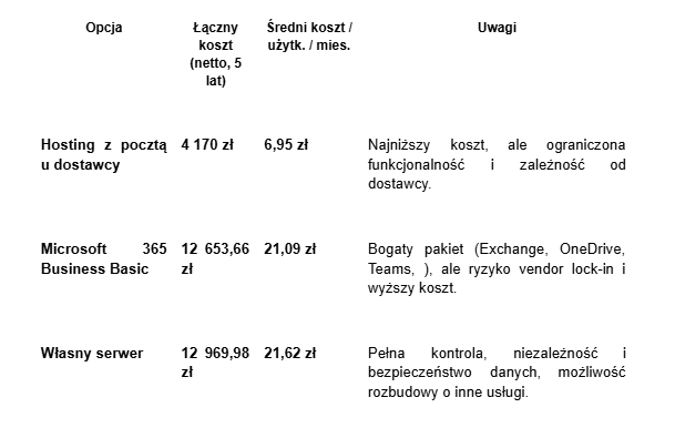 Jak widać, hosting z pocztą u dostawcy to najniższy koszt i prostota w postaci braku konieczności  utrzymania sprzętu, a także szybki start i wsparcie dostawcy w pakiecie. Należy jednak mieć na uwadze ograniczenia funkcjonalne i integracyjne w porównaniu do Microsoft 365. W tej sytuacji jesteśmy także zależni od jakości systemów antyspamowych i wartości SLA u dostawcy.